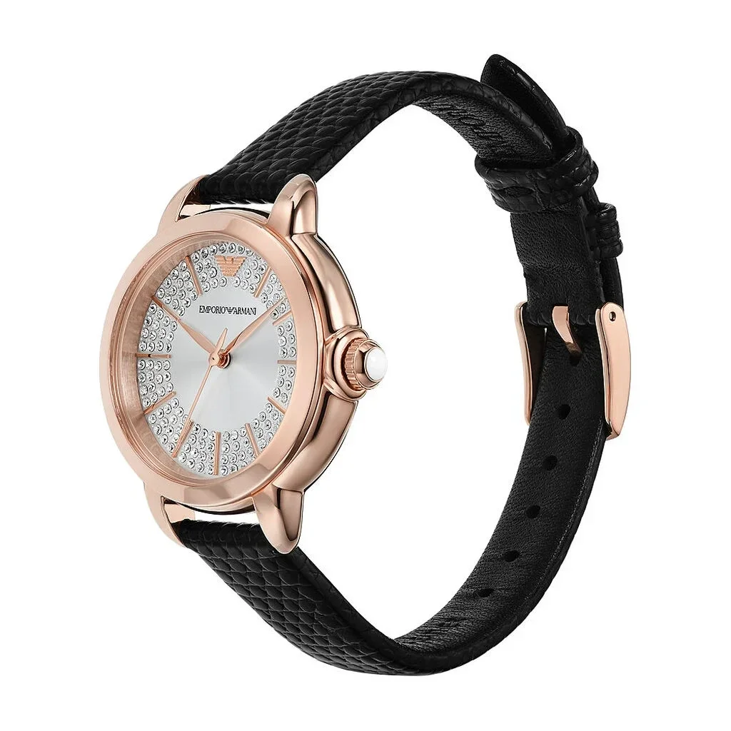 Montre Armani Acier Rose Ronde Quartz 32mm Fond Argente Strass Bracelet Cuir De Vache Noir Ar11631