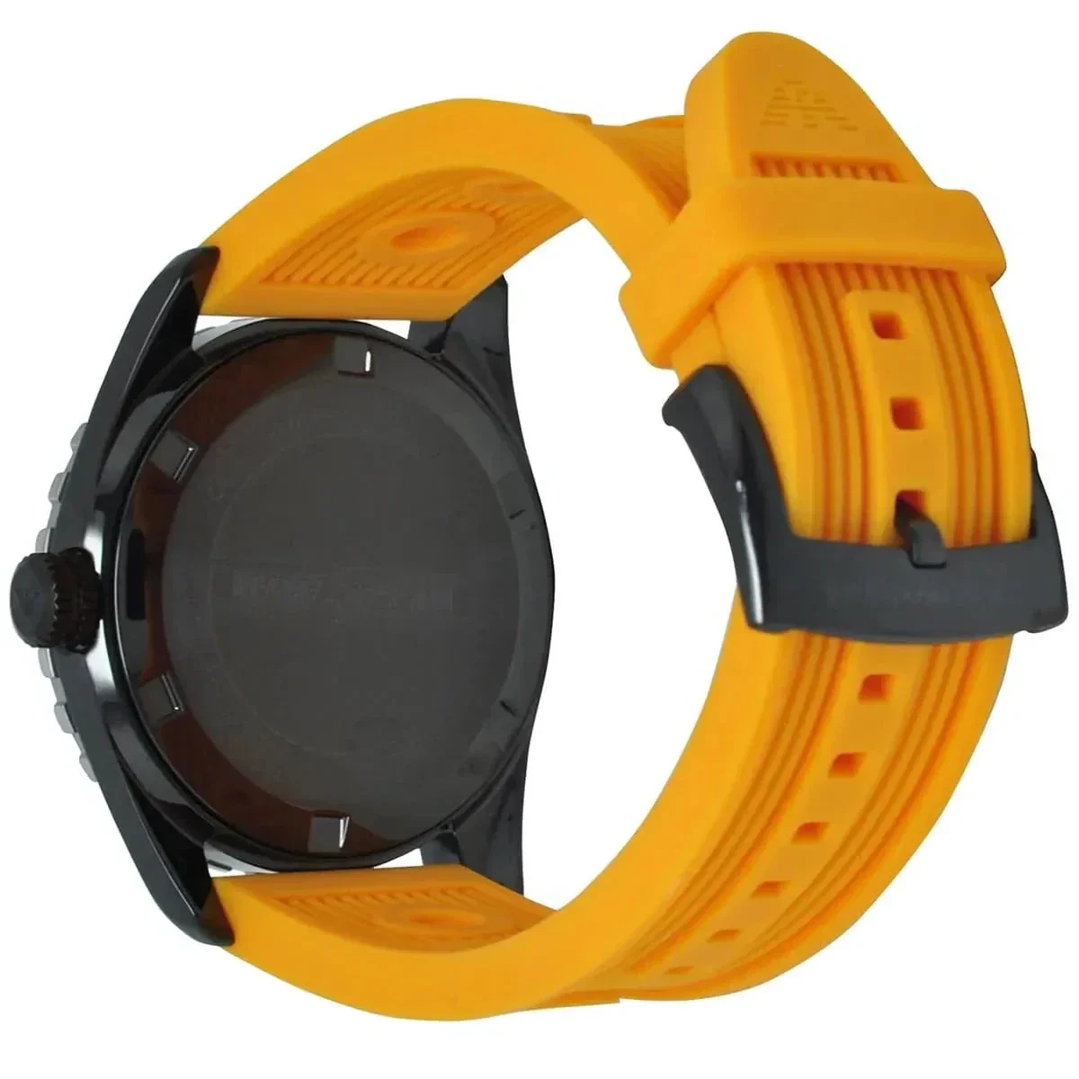 Le modèle AR6046 au look plutôt sportif, se compose d'un bracelet orange en silicone et d'un boîtier en acier inoxydable de couleur noire.