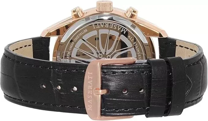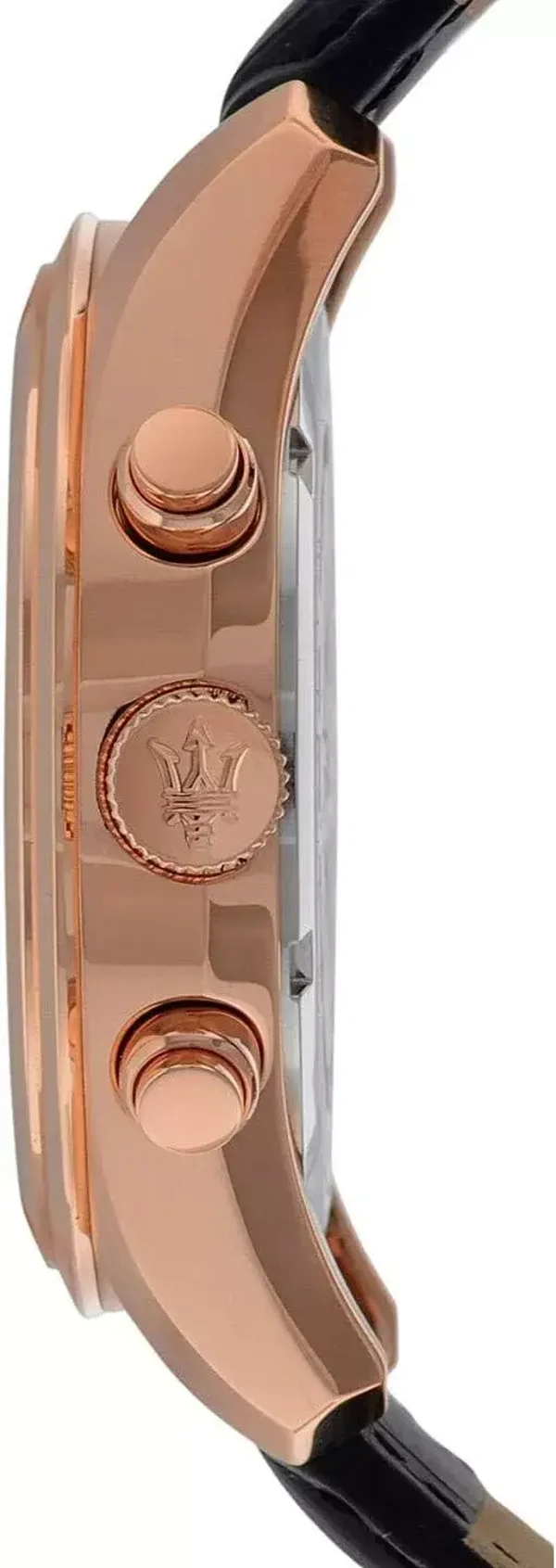 Marque Maserati Collection Traguardo Code du produit R8871612002 Type d'article Montre Genre Homme Fonctions Multifonction, Chronographe, Date Type de Mouvement / Mécanisme Quartz MIYOTA JP15 (Batterie) Forme du Boîtier Ronde Matériau du Boîtier Acier Inoxydable Couleur du Boîtier Or Rose Diamètre du Boîtier Ø45 mm Type de Cadran / Afficher Analogique Couleur du Cadran / Afficher Noir Matériau de la Sangle Cuir Couleur de la Sangle Noir Résistance à l'eau 100 mètres / 10 bar