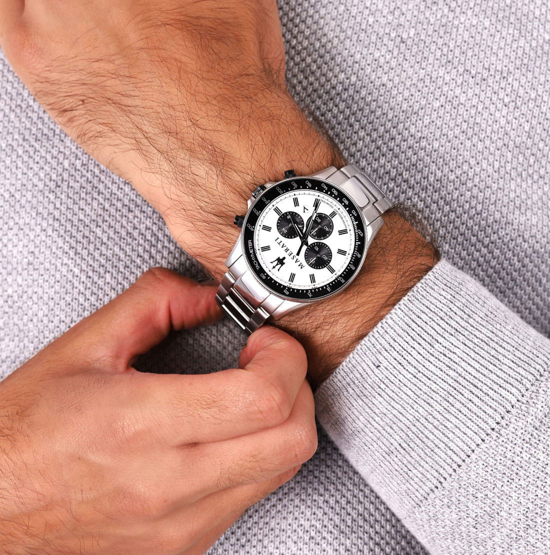 Design Maserati Sfida: Le cadran blanc aux index noirs offre une lisibilité exceptionnelle, tandis que le guichet dateur ajoute une fonctionnalité pratique. Chaque détail, y compris le logo emblématique de Maserati, reflète l'héritage automobile de la marque.