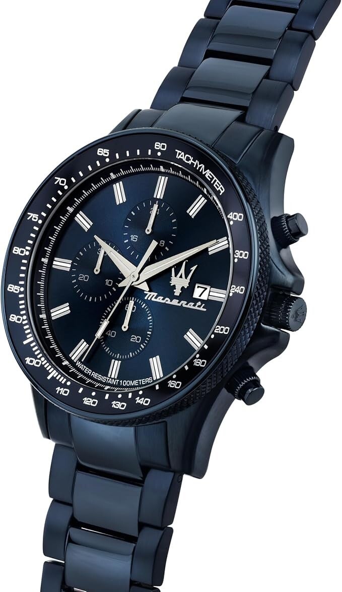- [Caractéristiques] Le boîtier de la montre mesure 44,00 mm, avec une épaisseur de 11,40 mm. Le cadran bleu à trois rotors et tachymètre est en verre minéral. Fermeture : Boucle déployante. Maserati Blue n'est pas seulement une couleur mais une expression de style et de raffinement. C'est précisément cette couleur qui devient le protagoniste de la nouvelle Blue Edition Maserati, un hymne à l'élégance, à l'histoire et au caractère de la Marque.