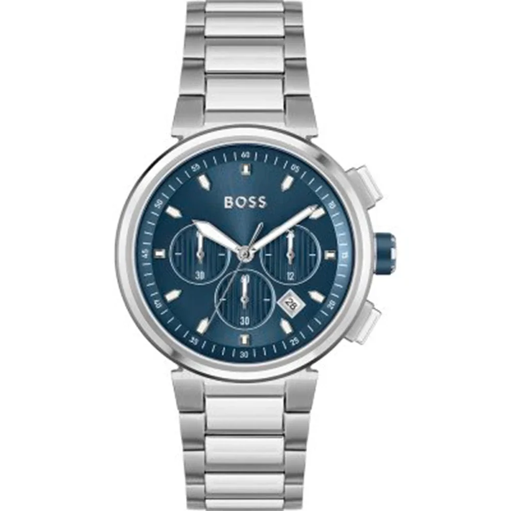 Montre Boss One en Métal ArgentéPensée pour les hommes élégants, la montre One 1513999 de Boss nous séduit par son design à la fois chic et décontracté. Elle n'hésite pas à jouer sur les détails et sur les différentes couleurs pour accentuer son charme. Que vous soyez plutôt du style classique ou casual, ce modèle deviendra rapidement une pièce maîtresse de votre collection. Tenu par un bracelet en maille acier argent, le boîtier rond de 44 mm de diamètre séduira les amateurs d’accessoires imposants. Le cadran se pare d’un fond bleu foncé à l’effet soleillé qui contraste merveilleusement bien avec les index et les aiguilles blancs et argentés. Les trois chronographes présents sont situés bas de ce dernier pour faciliter leur lecture. Protégée d’un verre minéral, cette montre résiste aux chocs et rayures du quotidien, et reste étanche jusqu’à 50 mètres de profondeur. - mouvement à quartz - bracelet en acier - boucle déployante - 3 compteurs de chronographes - verre minéral protecteur - étanchéité jusqu’à 50 mètres.